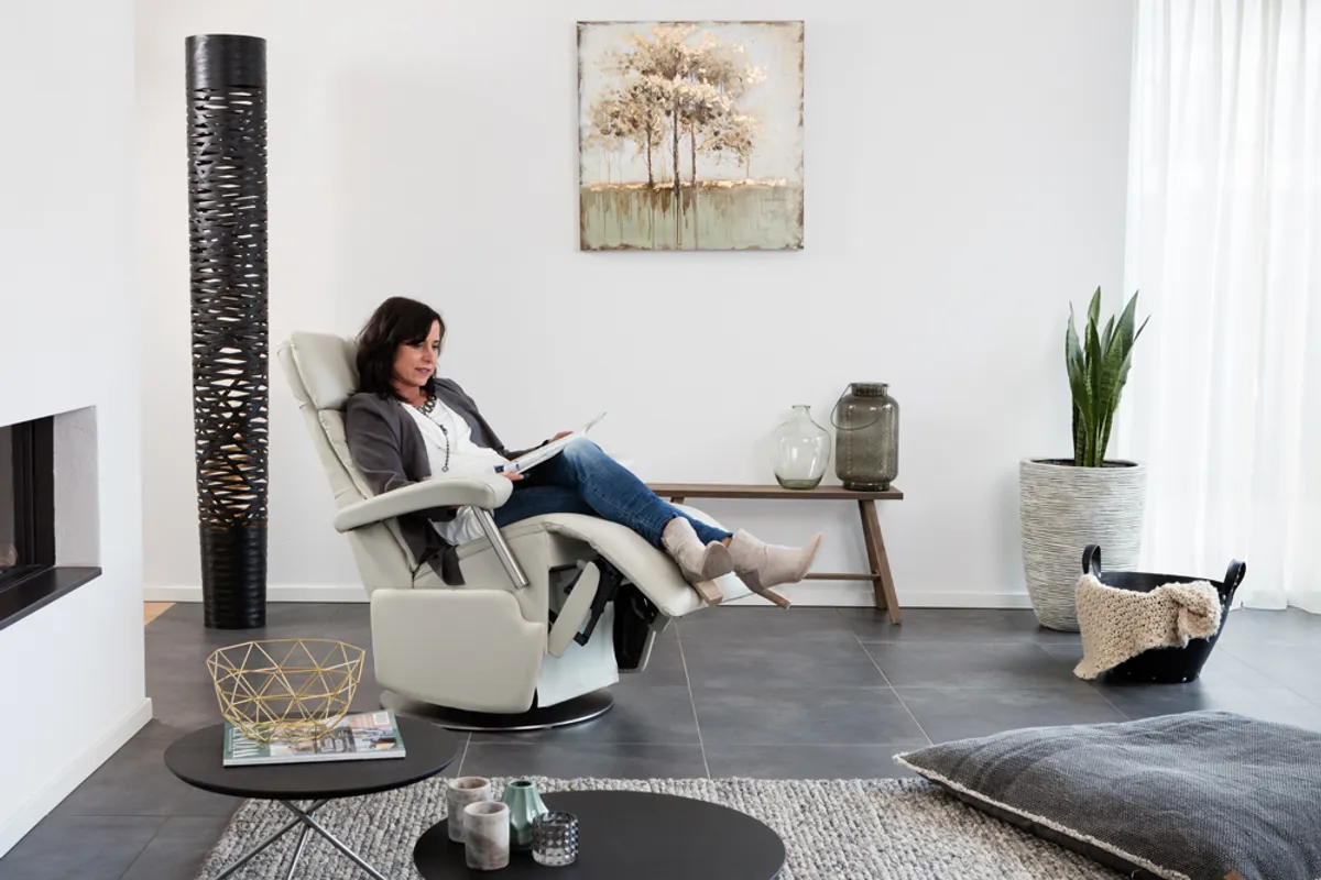 Die einzigartigen Armlehnen folgen dem Körper während der Verstellbewegungen, was den Sitzkomfort noch weiter steigert. Der Fitform Wellness 614 ist vielseitig, da er auf Wunsch nicht nur in Leder, sondern auch mit einem hochwertigen Stoffbezug erhältlich ist. Dieser Sessel ist eine ausgezeichnete Wahl für alle, die sowohl Stil als auch Bequemlichkeit schätzen.
