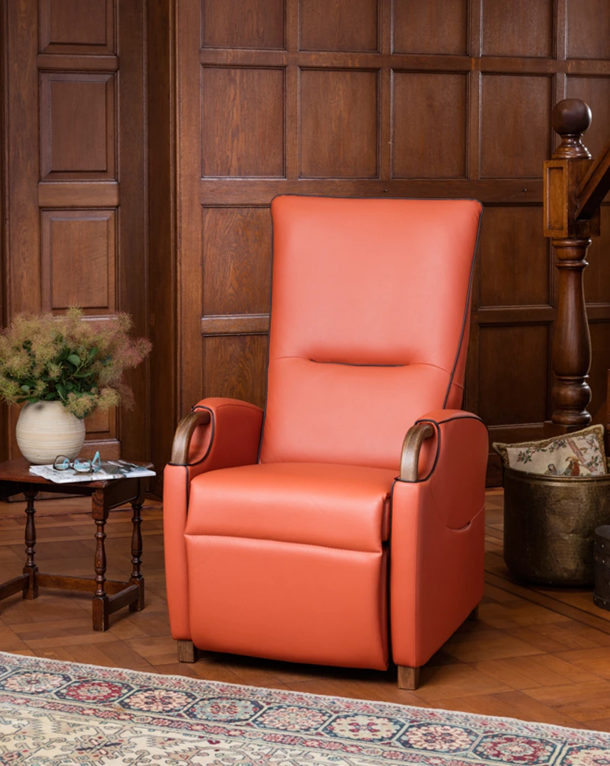 - Hölzerne Armlehnen und Füße in verschiedenen Holztönen